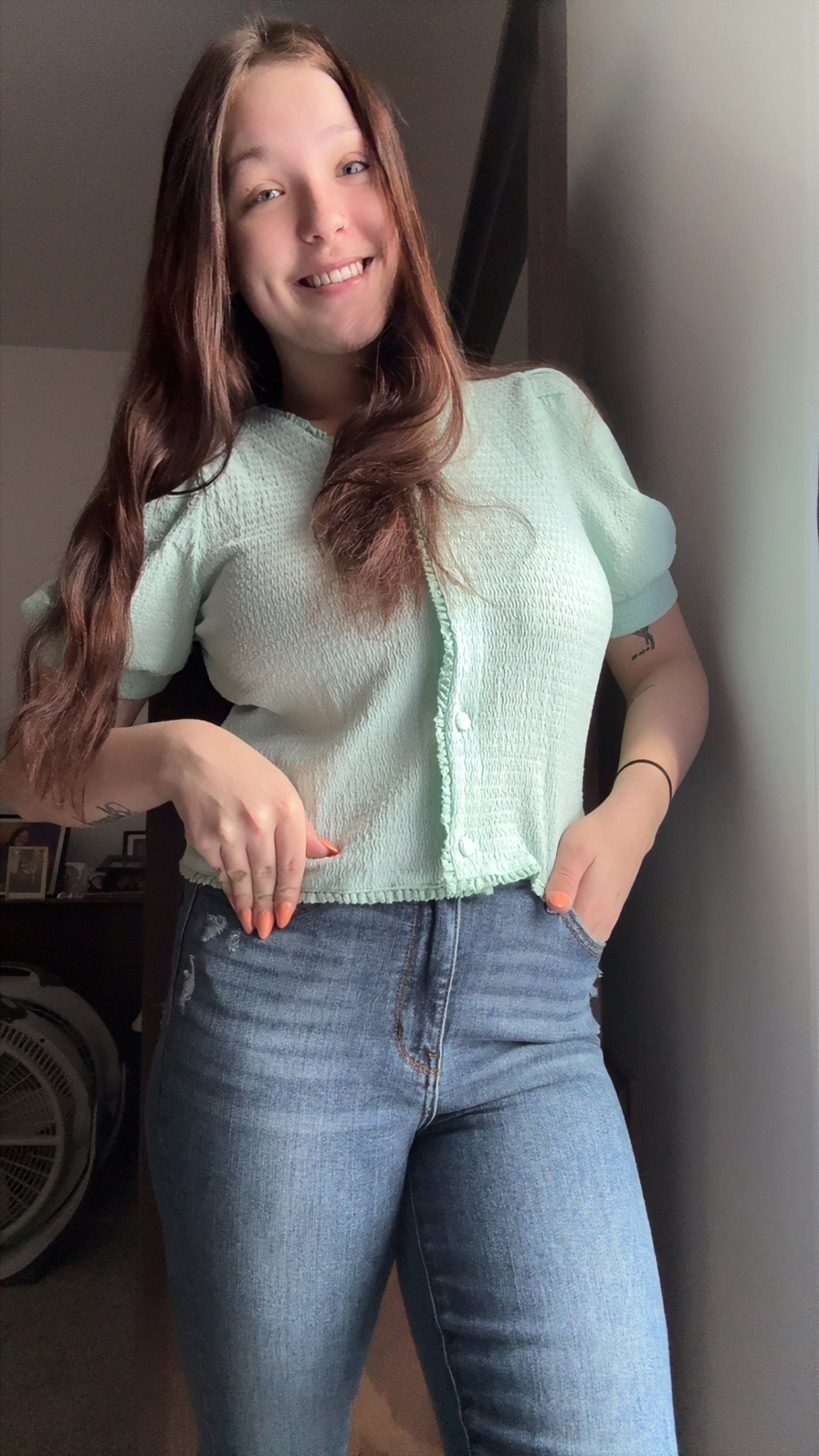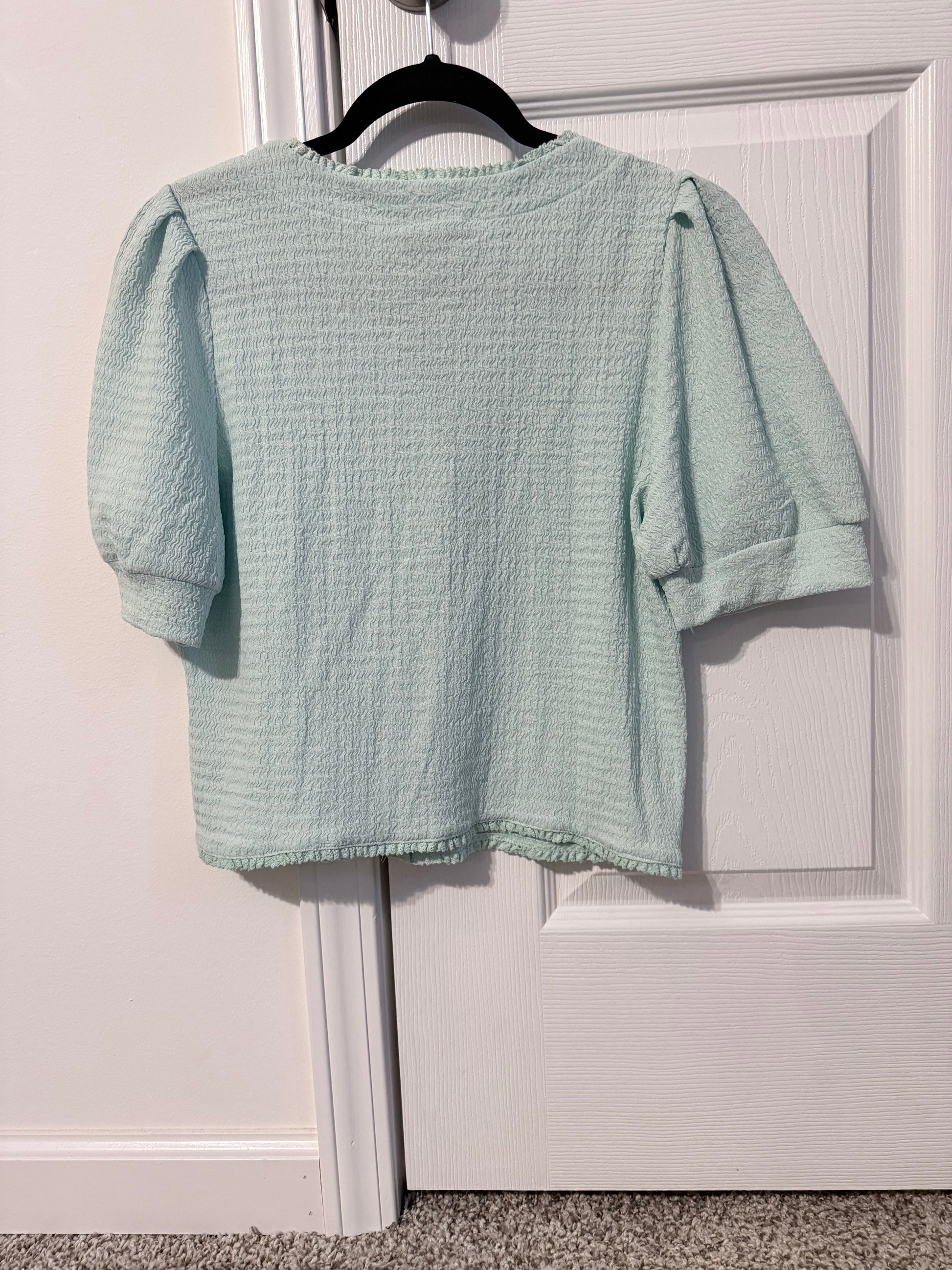 Stay effortlessly cute and comfortable in our Mint Breeze Button Knit Top 💚